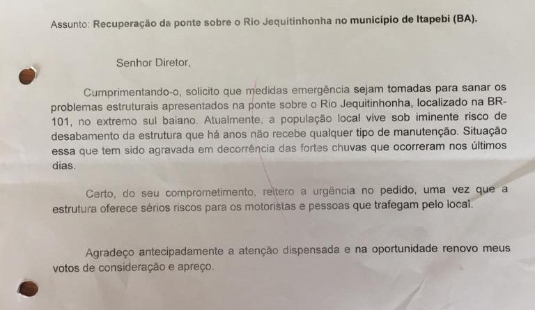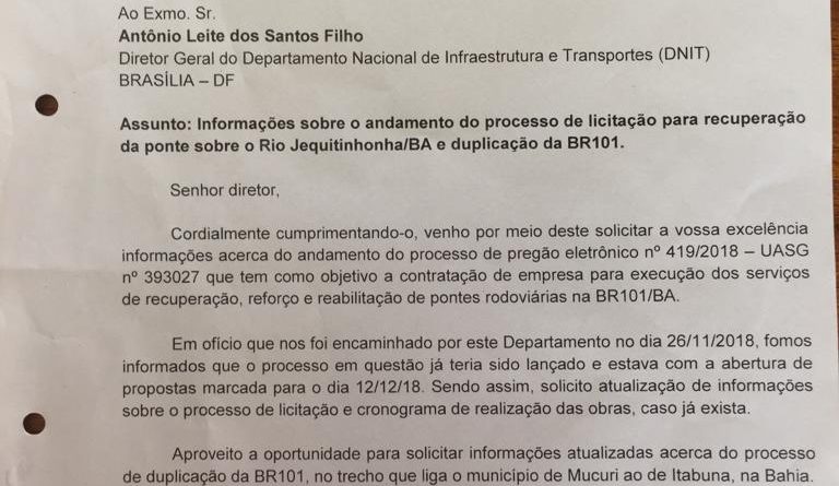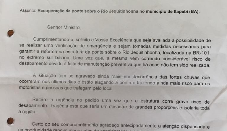 A novela da reforma da ponte do Rio Jequitinhonha, na BR 101, no município de Itapebi, no extremo sul da Bahia, ganha mais um capítulo, agora tendo como protagonista o deputado federal Uldurico Jr, que postou em sua rede social vídeo ao lado do diretor geral do DNIT (Departamento Nacional de Infraestrutura de Transportes), general Antônio Leite dos Santos Filho, que prometeu para abril a licitação da obra de reforma da ponte e garantiu que não há risco da estrutura atual sofrer danos, uma vez que houve vistoria recente no local. Inicialmente haverá recuperação dos pilares, segundo o diretor geral. A assessoria de Uldurico enviou à Redação do Bahia40graus ofícios protocolados, no final de 2018 e início deste ano, junto ao DNIT e ao Ministério dos Transportes, cobrando providências diante do estado precário da ponte.