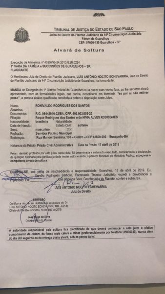 Nesta quinta-feira, 18 de abril, foi expedido alvará de soltura a favor de Ronivaldo Rodrigues (Roni), pelo Tribunal de Justiça de São Paulo, corte de origem do mandado de prisão cumprido pela Polícia Civil de Eunápolis, ontem, contra o advogado e assessor especial do prefeito de Eunápolis, Robério Oliveira. Com o alvará, Roni deixa a 23ª Coorpin. O motivo da prisão foi dívida de pensão pensão alimentícia. Até o momento, a defesa de Roni não se manifestou.