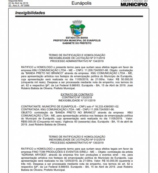 Apesar dos muitos problemas encontrados na Saúde, Educação e Infraestrutura da cidade, o prefeito Robério vai gastar só com 3 atrações musicais R$ 128 mil nos festejos de aniversário de emancipação política de Eunápolis, comemorado no dia 12 de maio. O curioso é que a banda local “Arriba Saia”, mais famosa na região vai levar o cachê menor. Confira as publicações no Diário Oficial.