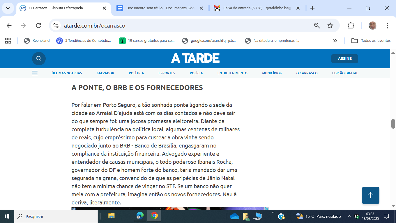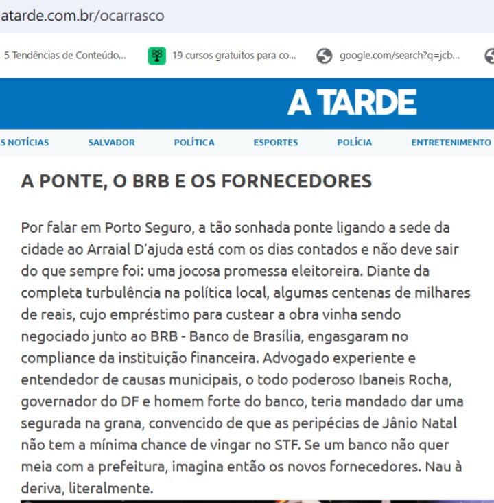 A coluna do jornal centenário ainda carimbou que a ponte Porto-Arraial, promessa eleitoreira faraônica que estaria sendo articulada com dinheiro emprestado do BRB (Banco de Brasília), dificilmente será construida enquanto o STF não julgar o caso da 3ª eleição de Jânio, que pode convocar uma nova eleição em Porto Seguro. O BRB segurou a tramitação do empréstimo.