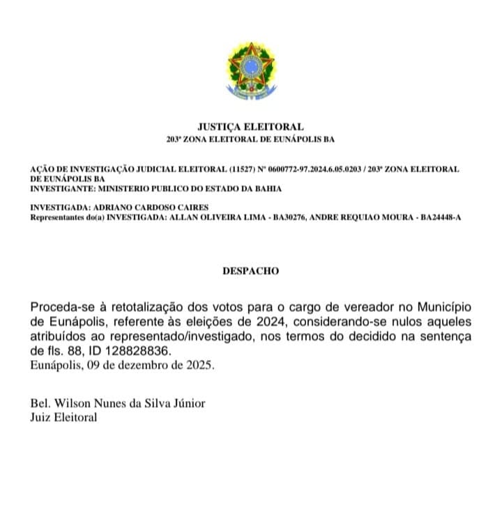 Com a nova decisão do juiz eleitoral de Eunápolis, Wilson Nunes, nessa terça-feira, 9 de dezembro, o cartório do TRE terá de recontar os votos para vereador na eleição de 2024, descartando os votos de Adriano Cardoso (PP), que teve o diploma cassado e parece que não pediu suspensão dos efeitos da decisão no recurso. Por isso, deverá ser afastado.
