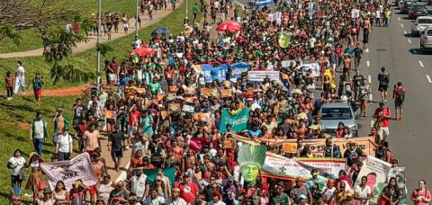 Milhares de indígenas de todo o Brasil marcham, nesta terça-feira (7), na Esplanada dos Ministérios, em Brasília. O ato integra a 22ª edição do Acampamento Terra Livre (ATL 2026), evento que começou no domingo (5) e é considerado a maior e mais importante mobilização do movimento no país.